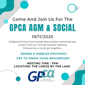 GOLDSWORTH PARK is defined as the area bounded by Robin Hood Road, St. John’s Road, Goldsworth Road, Bridge Barn Lane, Well Lane, Bullbeggers Lane, Horsell Birch and Littlewick Road, and all the residents of this area can register as members of the GPCA, regardless of their gender, ethnic origin, political, religious or other opinions. The GPCA does not charge membership fees, although it reserves the right to do so.